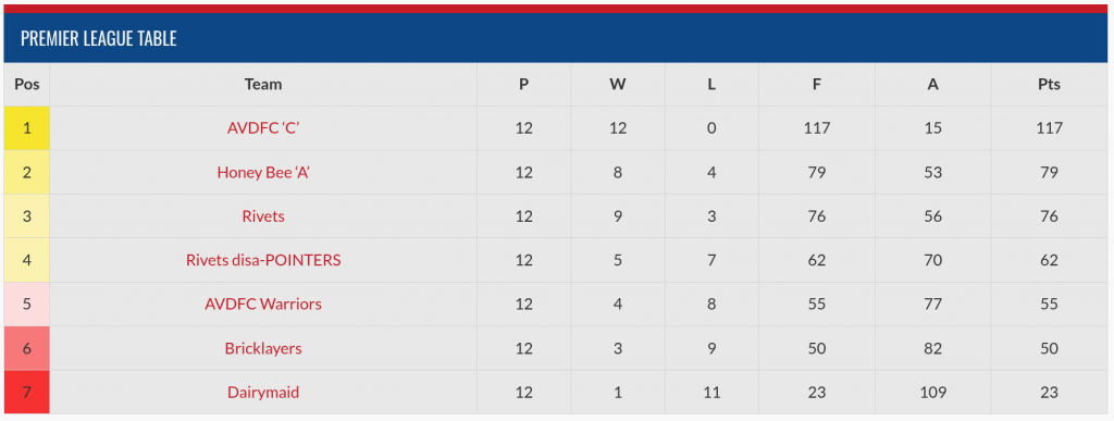 Would like to congratulate the AVDFC ‘C’ On winning the Prem Division with 117 points with an unbeaten streak, Honey Bee ‘A’ in second place.