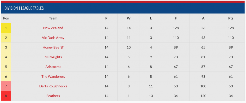 and the New Zealand winning Division 1 with 128 points again with an unbeaten streak, Vics Dads Army in second place.